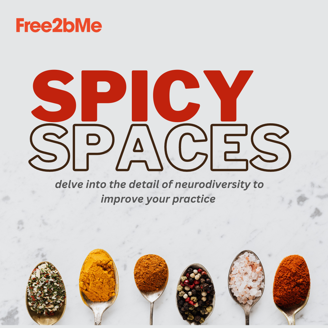 Image says “Spicy Spaces, delve into the detail of neurodiversity to improve your practice” with spoons containing spices underneath